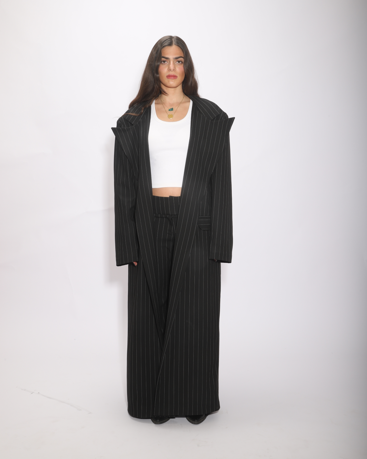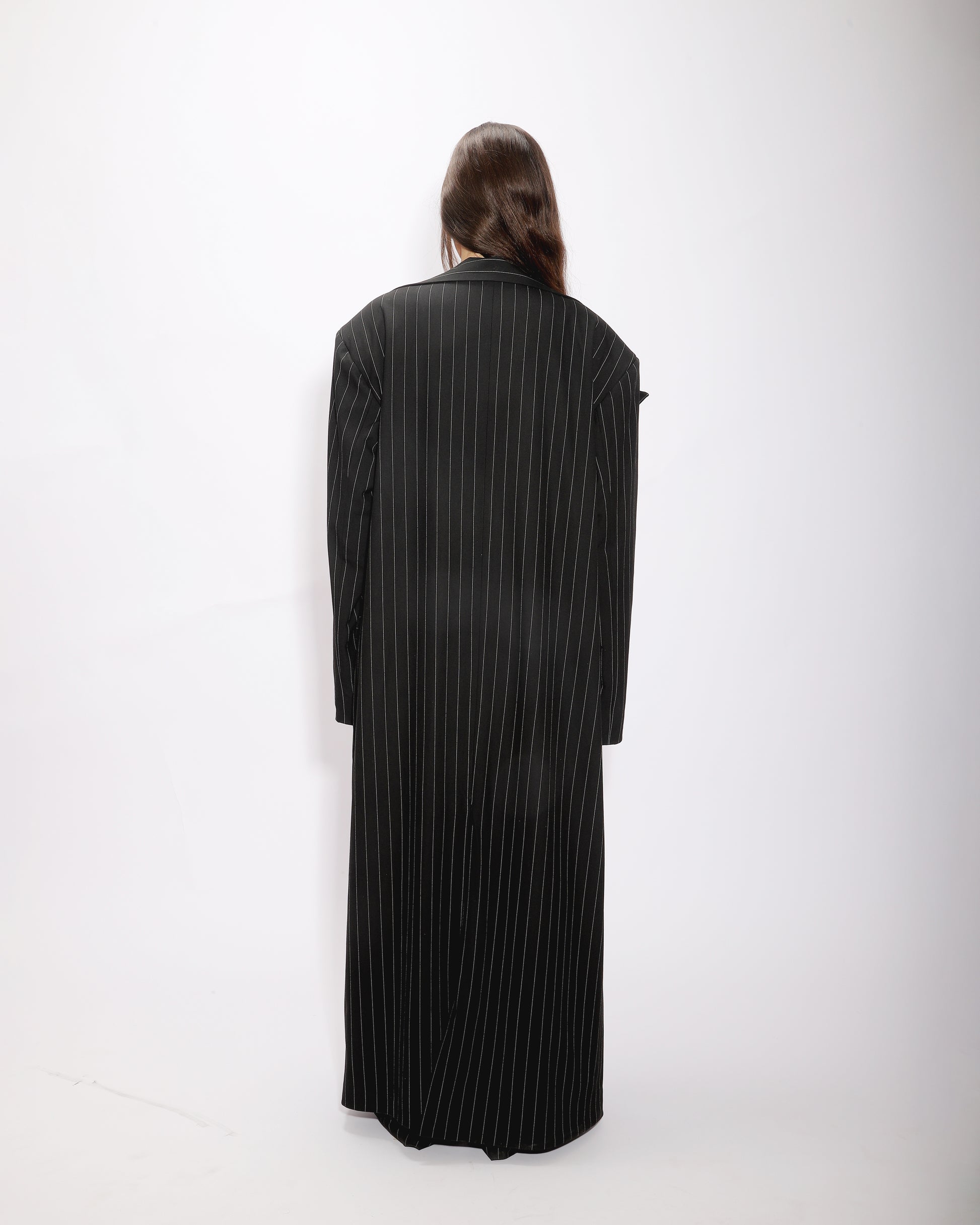 A striking floor-length coat with bold black stripes and strong shoulder pads, designed to command attention. The oversized fit and satin lining add a luxurious feel, while the structured shoulders give it a sharp, powerful edge. This piece brings an effortless, high-impact statement to any outfit.