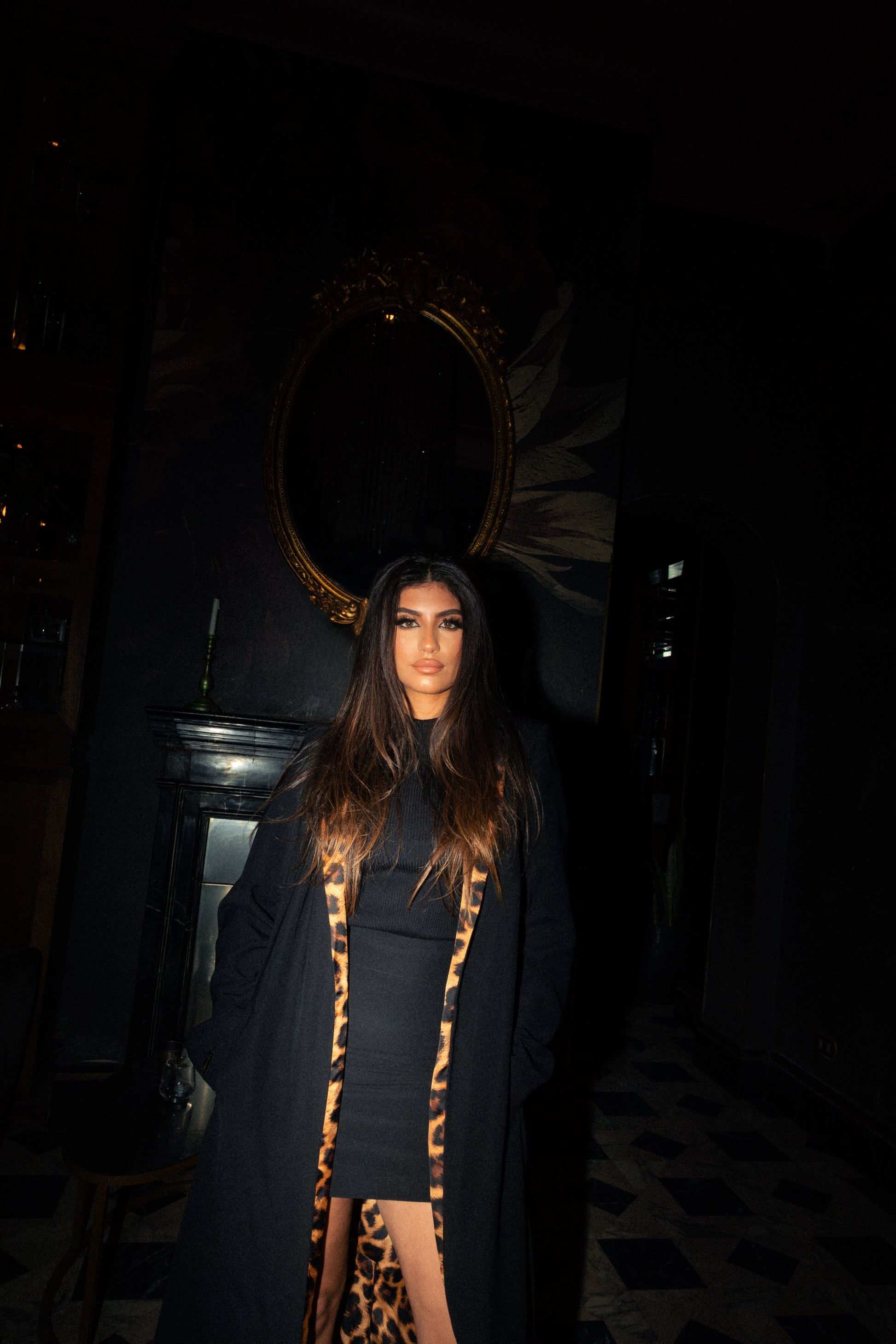 This satin lined, structured black fresco fabric coat designed to speak for itself. Followed in with clear cut shoulders and a floor-length flow, and sharp collar, the Leopard coat is an unmatched style symbol